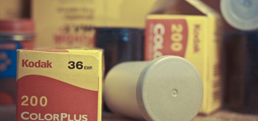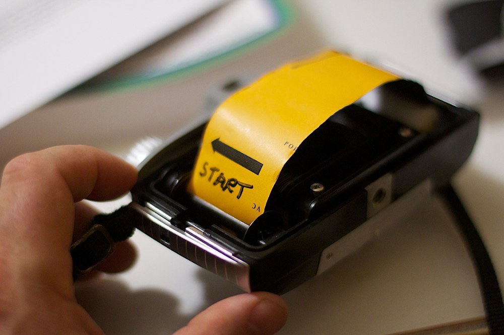 2. Insert the 35mm film cassette into the left side of the camera back. Once inserted, push the film rewind dial down to lock the film canister into place.