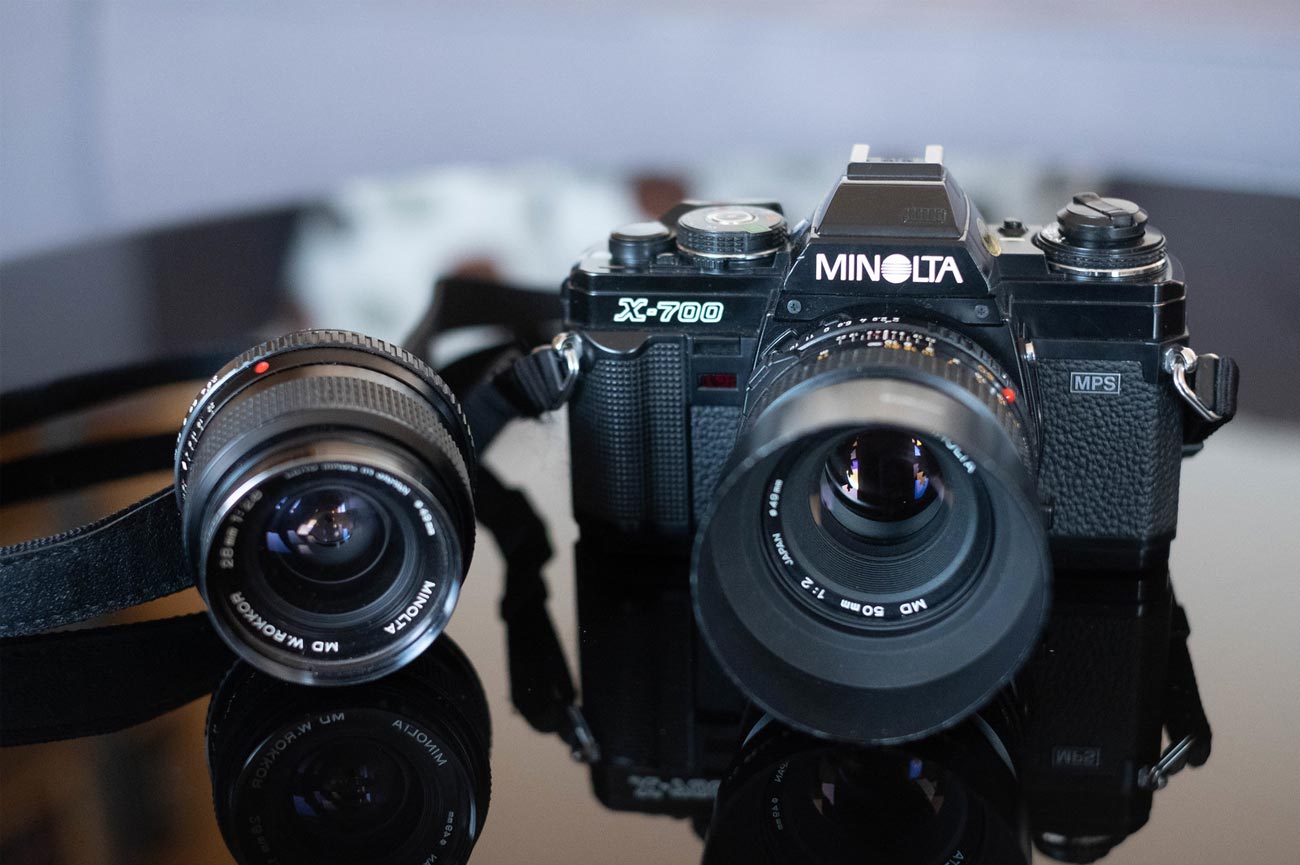 The Minolta X-700 was one of the last manual-focus 35mm film cameras made by Minolta and was the top-of-the-line model (subsequent Minolta models featured auto focus in addition to manual options.) The X-700 offers some key features for beginner photographers, including through-the-lens (TTL) metering, aperture priority exposure, and easy-to-understand controls