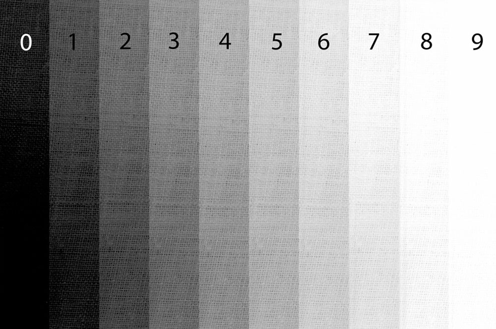 The zone system is divided into ten different zones, with zero being black and ten being white. Zone five is the middle gray, which most light meters attempt to measure. Below is a basic outline of each zone, zero through ten.